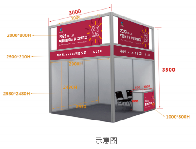 配置:楣板、洽谈桌椅、射灯、插座、地毯双开口需增加8%费用